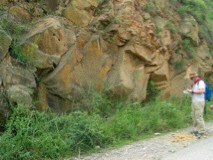 Idyllic Sichuan landscape with Longmenshan in background, Jiangyou. | Two major fracture sets are evident in these Upper Triassic sandstones, Guangyuan. | Polymictic Upper Triassic conglomerate, recycled as debris flow (well rounded but poorly sorted), Guangyuan. |