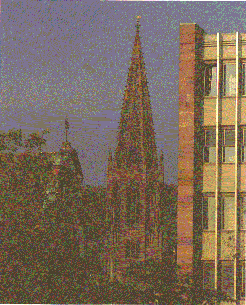 The Freiburger Münster contrasted with the newer architectural style of the Universität
